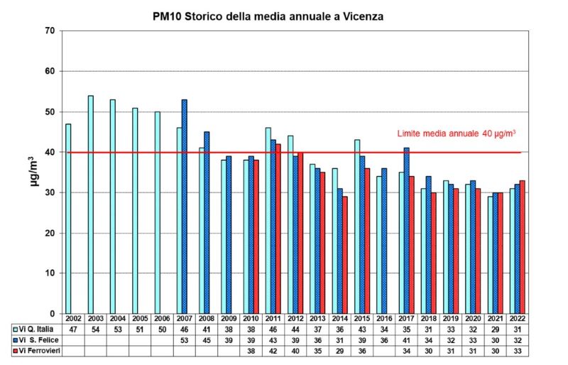 Il valore limite di 40 μg/m3 (microgrammi al metrocubo), previsto per la media annua, è stato rispettato in tutte le stazioni dal 2018 ad oggi.