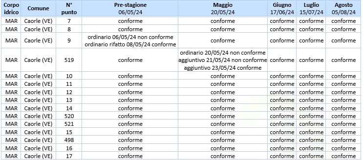 I risultati dei controlli 2024 effettuati ad oggi in mare Adriatico nel litorale di Caorle (VE). In Veneto ad oggi sono state effettuate 5 campagne balneazione in mare Adriatico; la prima pre stagionale, ha confermato l’idoneità di tutte le acque di balneazione all’apertura (15 maggio) della stagione balneare.