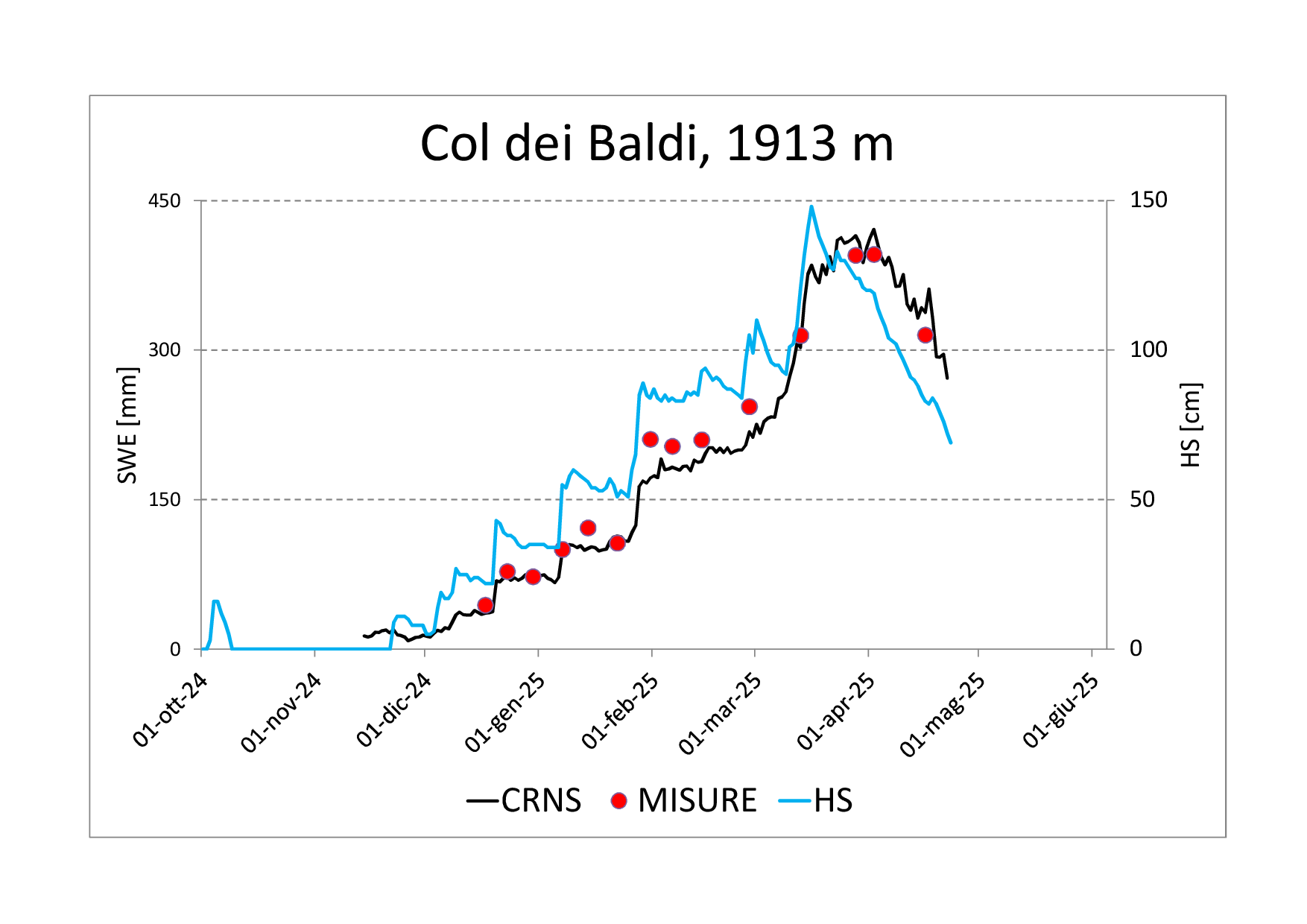 Stagione invernale 2024-2025- Stazione di Col dei Baldi, Dolomiti. Il grafico riprota il valore della altezza neve al suolo (HS, cm), i valori dei campionamenti di SWE di controllo (MISURE, mm) e i valori misurati dal sensore CRNS (mm).