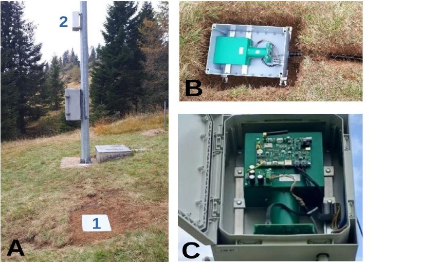 Stazione di Malga Losch. Nella foto A il sensore a terra (1) e il sensore di controllo a palo (2). Nella foto B particolare del posizionamento al suolo del CNR, nella foto C l'elettronica per il controllo a Palo.