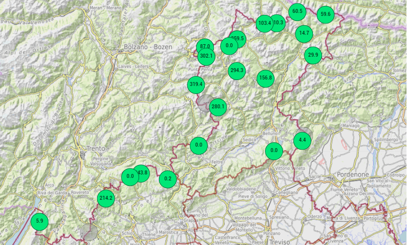 Mappa per Veneto con i sensori installati e operativi. I numeri nel cerchio verde sono i valori di SWE del 20 aprile 2025.