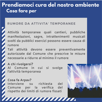 rumoreAttività temporanee quali cantieri, pubbliche manifestazioni, sagre, intrattenimenti musicali svolti da pubblici esercizi possono essere causa di rumore. Il rumore viene distinto dal suono perché è generato da onde acustiche irregolari e non periodiche, percepite come sgradevoli e fastidiose