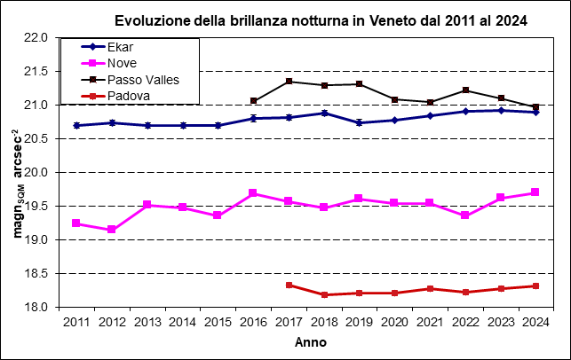 - La stazione di Padova di ARPAV presenta un valore modale per l’anno 2024 pari a 18.31, con un cielo migliaia di volte più luminoso di un cielo naturale, e la visibilità delle stelle assai compromessa (solamente alcune decine di stelle visibili ad occhio nudo).