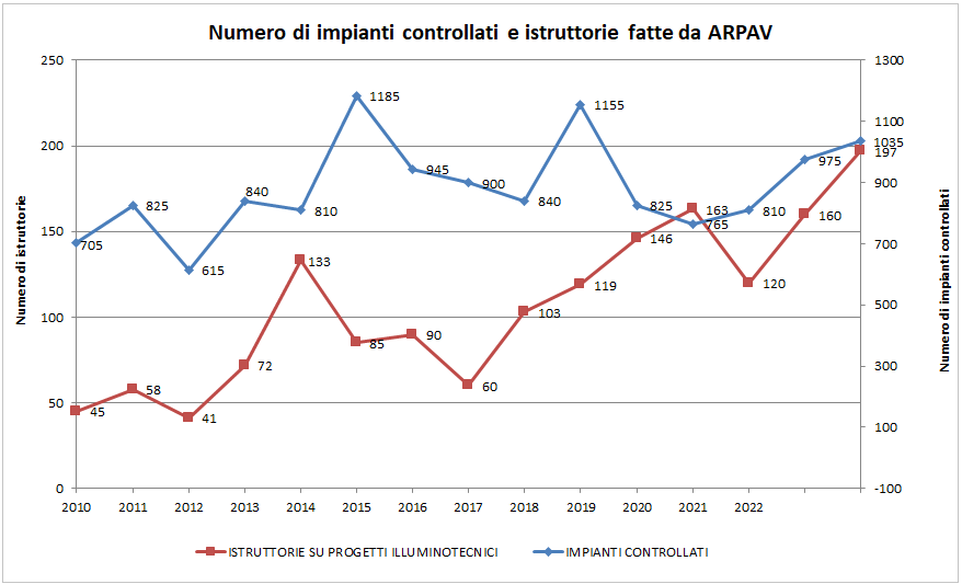 Quantificare l’azione di ARPAV sulla tematica inquinamento luminoso, in particolare i controlli degli impianti di illuminazione e le istruttorie su progetti illuminotecnici.