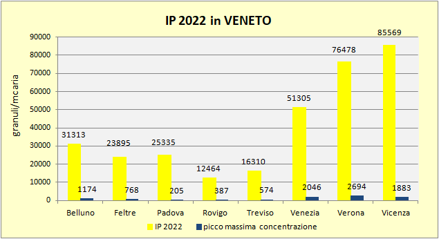Il grafico n. 1 riporta l’Indice Pollinico Annuo (IP) 2022 calcolato per ogni stazione di monitoraggio della Regione Veneto e il rispettivo picco di massima concentrazione. L’analisi dei dati mostra che la maggiore quantità pollinica è stata registrata nelle stazioni di Vicenza, Verona e Venezia. Negli altri siti planiziali, Padova ha riscontrato concentrazioni maggiori rispetto a Treviso. Per quanto riguarda i siti montani, a Belluno è stata rilevata una quantità pollinica maggiore rispetto a Feltre. I dati inerenti la stazione di Rovigo sono parziali per cambio sede del campionatore.