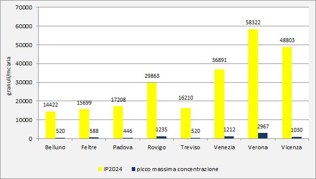 Nel picco di massima concentrazione, i pollini predominanti nei siti montani sono quelli di nocciolo e carpino nero, rispettivamente a Belluno e Feltre; anche a Padova il polline predominante nel picco è quello del carpino nero. Diversa la situazione di Vicenza, Rovigo e Treviso, dove è il cipresso il polline dominante nel picco. Invece a Verona e Venezia, sono relativamente i pollini di betulla e delle graminacee rappresentativi dell’apice di concentrazione.