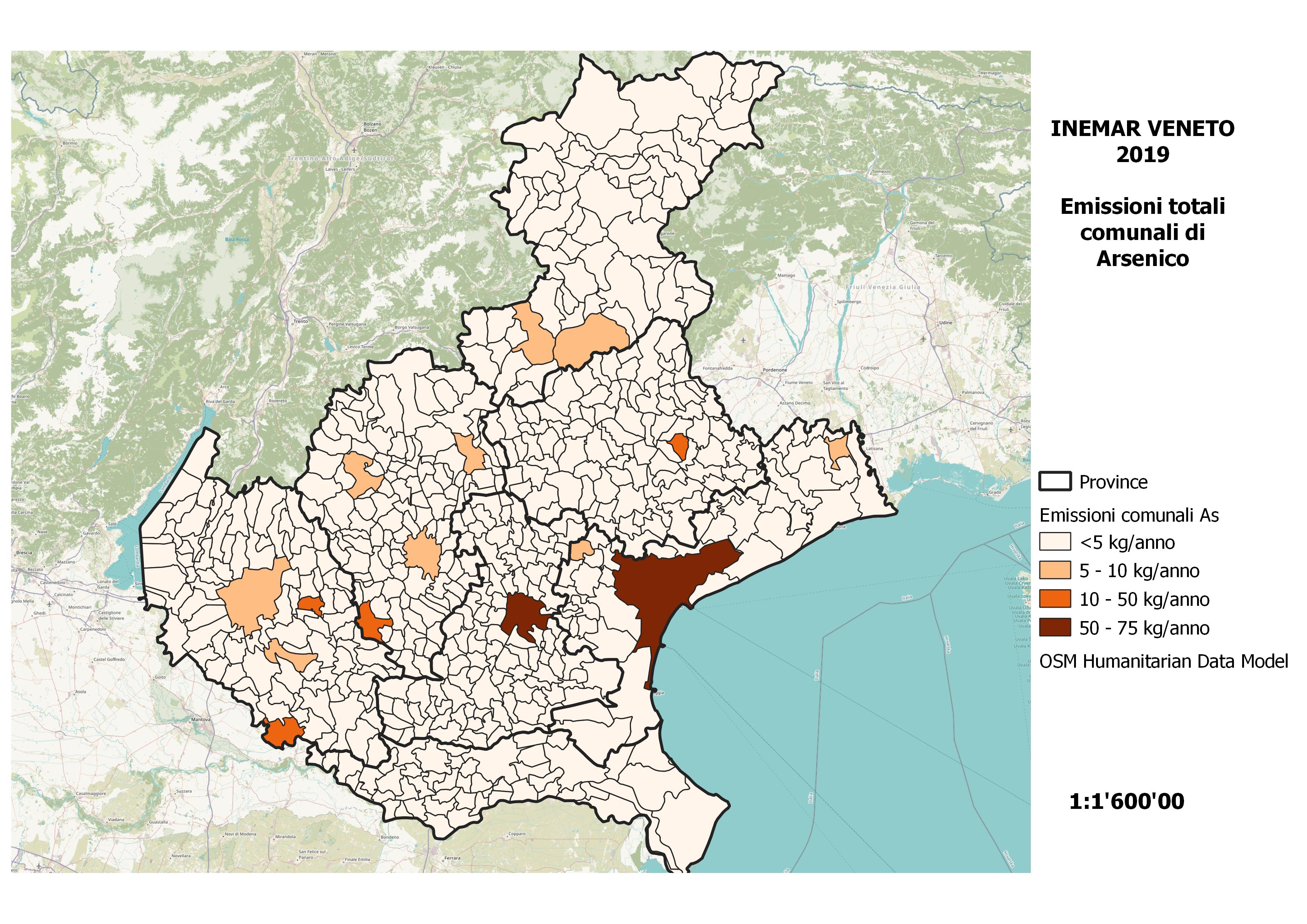 In Veneto nel 2019 le emissioni di arsenico (As) sono prodotte per l’81% dal comparto industriale (12% dal M01 – Produzione di energia, 50% dal M03 – Combustione nell'industria e 19% dal M04 – Processi produttivi), seguito dal M07 – Trasporti su strada con il 9% sul totale regionale.