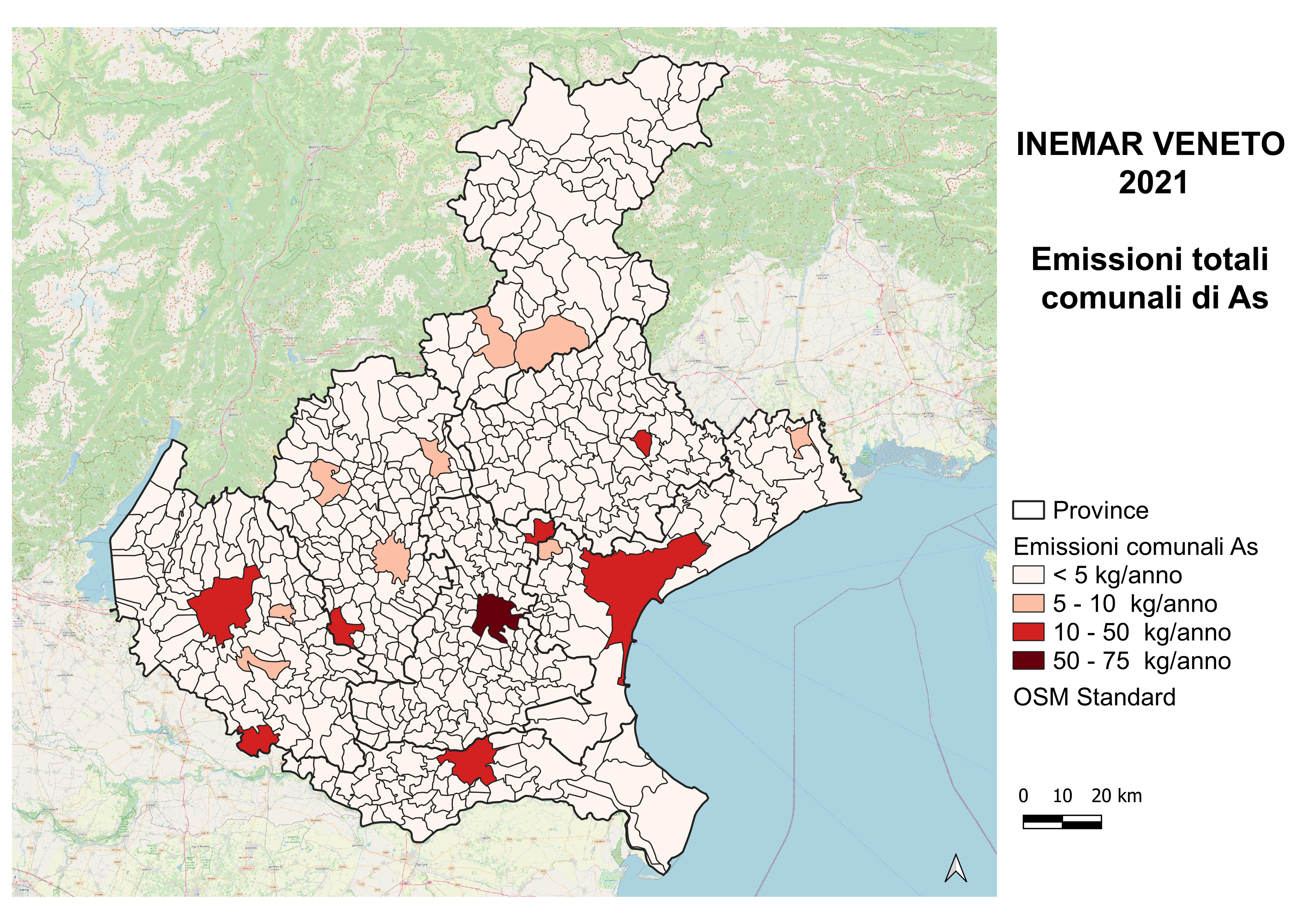 In Veneto nel 2021 le emissioni di arsenico (As) sono prodotte per il 77% dal comparto industriale (3% dal M01 – Produzione di energia, 47% dal M03 – Combustione nell'industria e 27% dal M04 – Processi produttivi), seguito dal M07 – Trasporti su strada con il 10% sul totale regionale.
