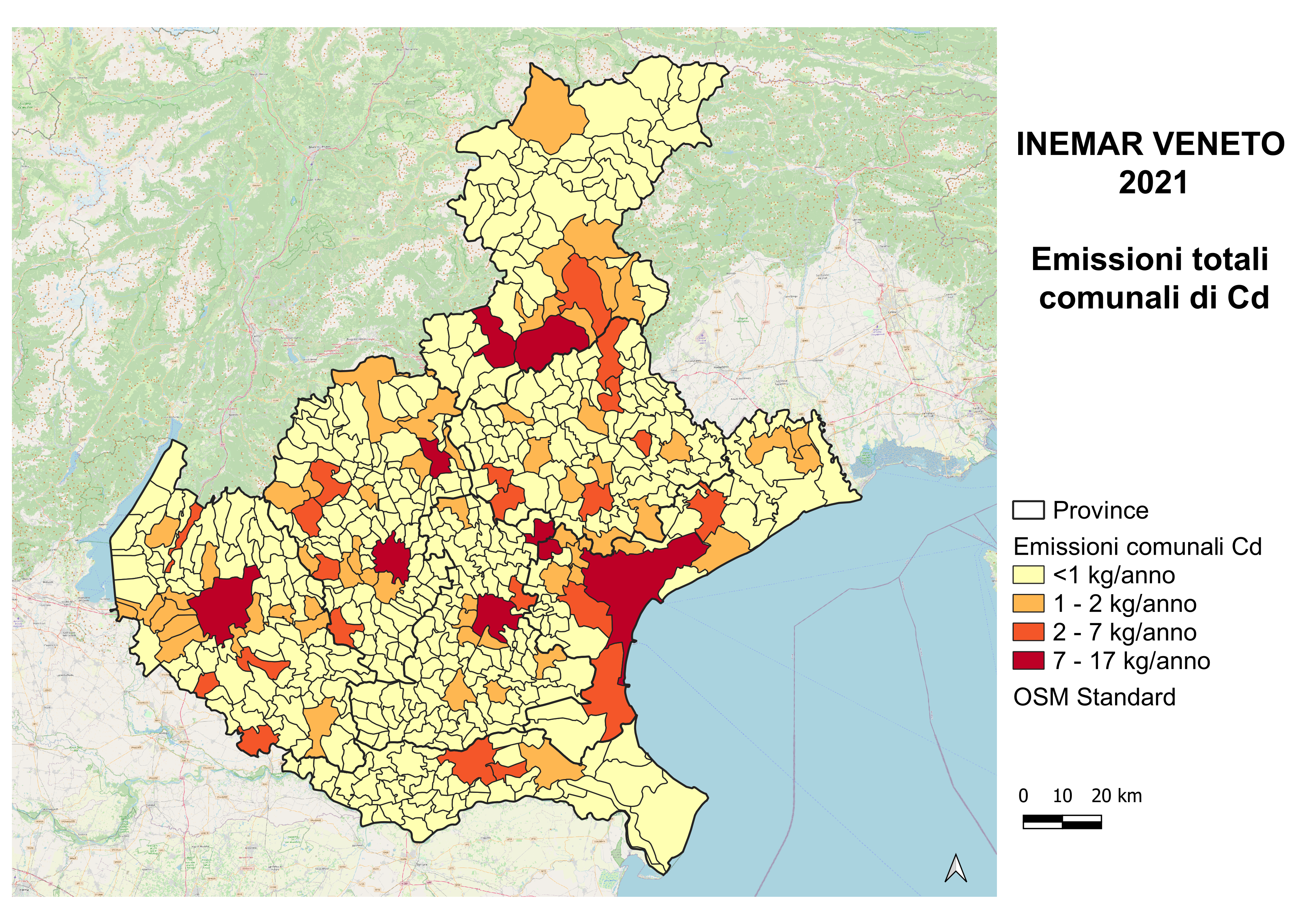 Le emissioni di cadmio (Cd) derivano principalmente dal M02 – Combustione non industriale con il 62% sul totale regionale, e secondariamente dalle fonti industriali (16% dal M03 – Combustione nell’industria, 4% dal M04 – Processi produttivi e 1% dal M01 – Produzione di energia), segue M07 – Trasporti su strada, con l’9% sul totale regionale.