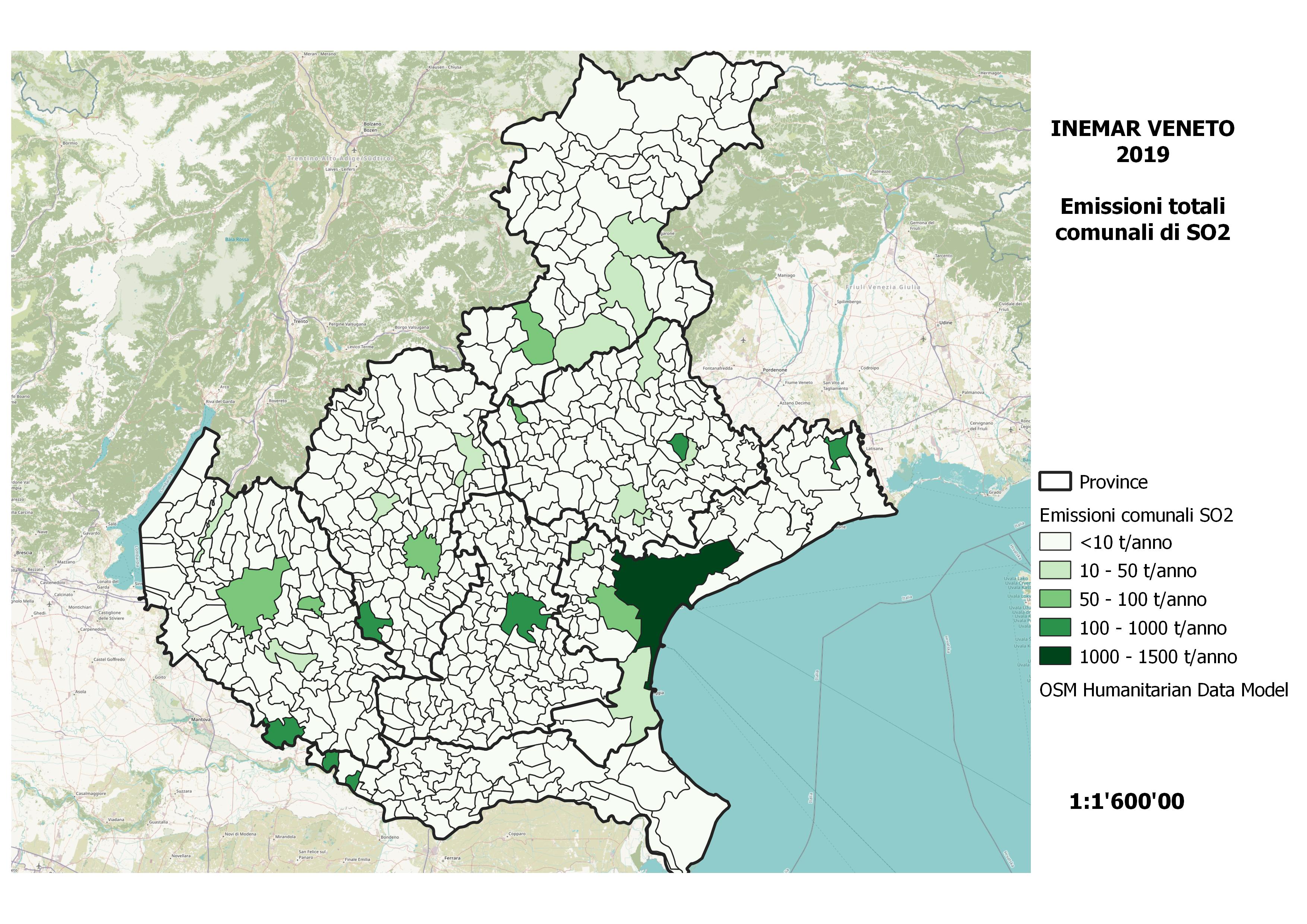 In Veneto nel 2019 le emissioni di SO2 derivano per il 51% dal M03 – Combustione nell'industria, per il 16% dal Macrosettore M01 – Produzione di energia e trasformazione di combustibili, per il 13% dal M04 – Processi produttivi, per il 10% dal M02 – Combustione non industriale e per il 9% dal M08 – Altre sorgenti mobili e macchinari.