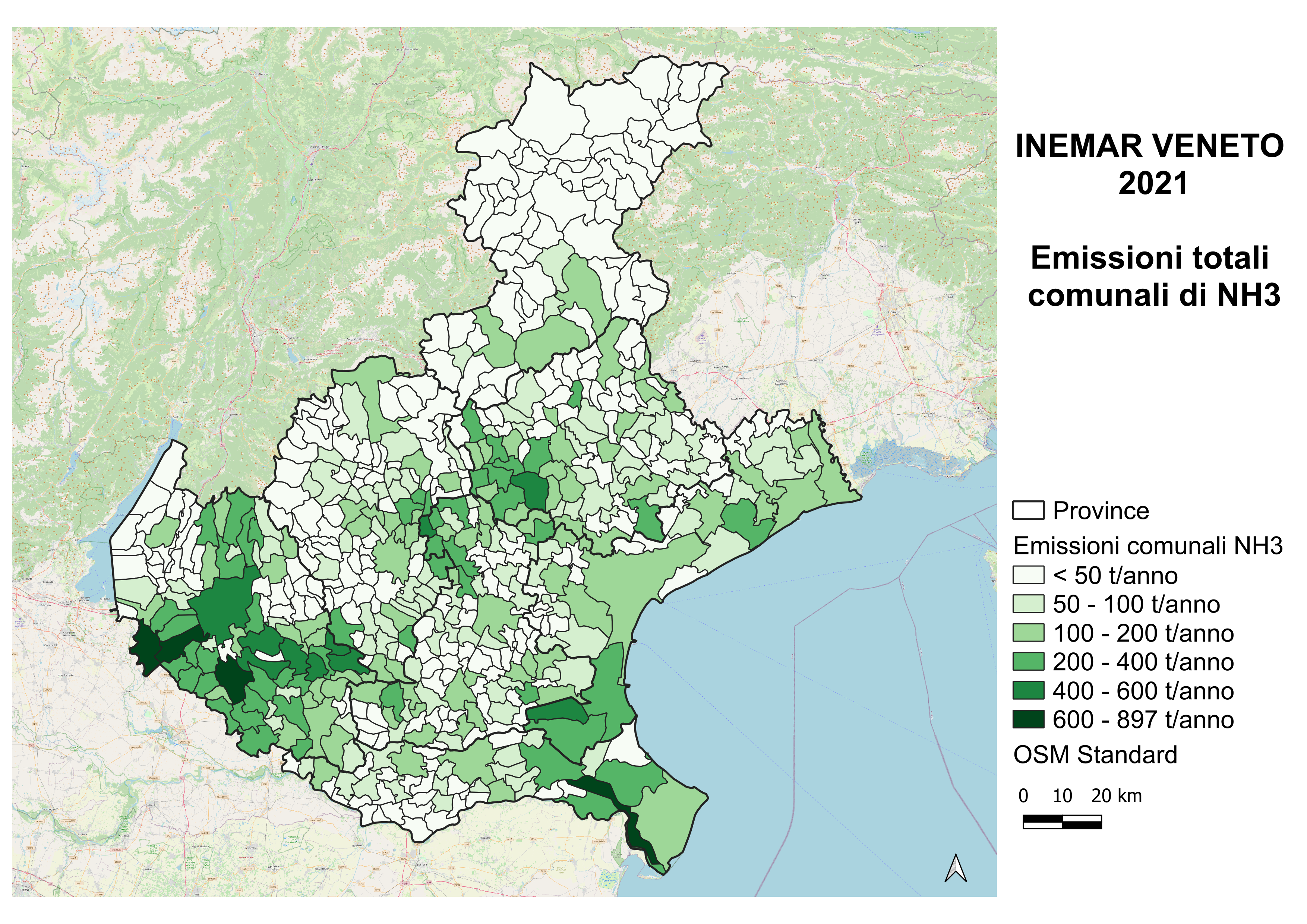 Mappe regionali delle emissioni annuali a livello comunale di Biossido di zolfo (SO 2 ), Ossidi di azoto (NOx), Ammoniaca (NH 3 ), basate su INEMAR Veneto 2021