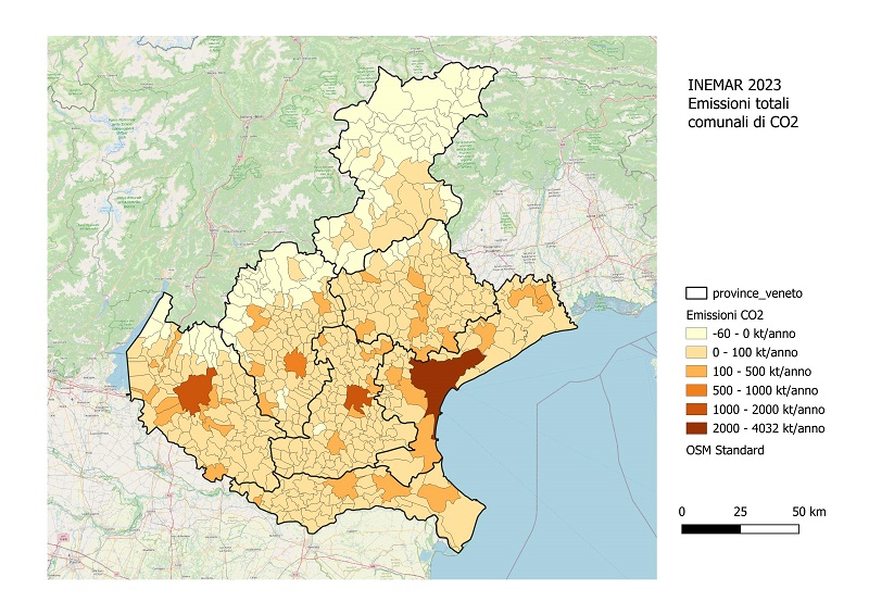Mappe regionali delle emissioni annuali a livello comunale di Anidride Carbonica (CO2), Metano (CH4), Protossido di Azoto (N2O), basate su INEMAR Veneto 2023