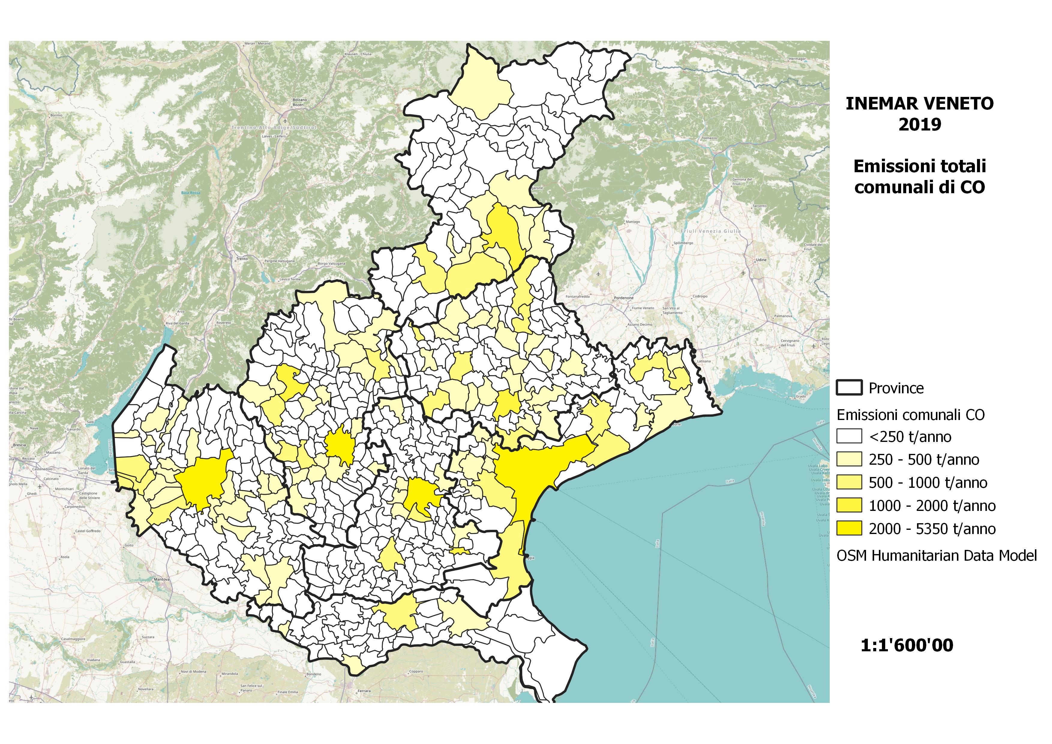 In Veneto nel 2019 le emissioni di CO sono prodotte per il 58% dal M02 – Combustione non industriale, con particolare rilevanza delle emissioni prodotte dalla combustione della legna nel settore residenziale, seguito dal M07 – Trasporto su strada con un contributo pari al 22% del totale regionale.