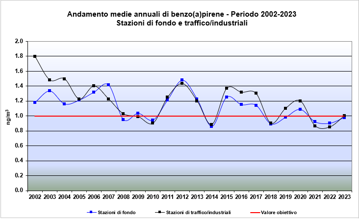 Fig 2 - Andamento della media annuale di benzo(a)pirene (in ng/m3) dal 2002 al 2023 nelle stazioni “medie” regionali confrontato con il Valore Obiettivo annuale (1.0 ng/m3).