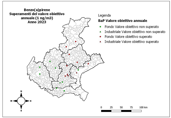 La soglia di concentrazione in aria del benzo(a)pirene è stabilita dal D.Lgs. 155/2010 e calcolata su base temporale annuale. La valutazione dello stato attuale dell’indicatore è basata sul numero di superamenti, registrati presso le stazioni di monitoraggio della qualità dell’aria della rete regionale ARPAV, del Valore Obiettivo (VO) annuale di 1.0 ng/m3. Tale inquinante viene determinato analiticamente sulle polveri PM10.