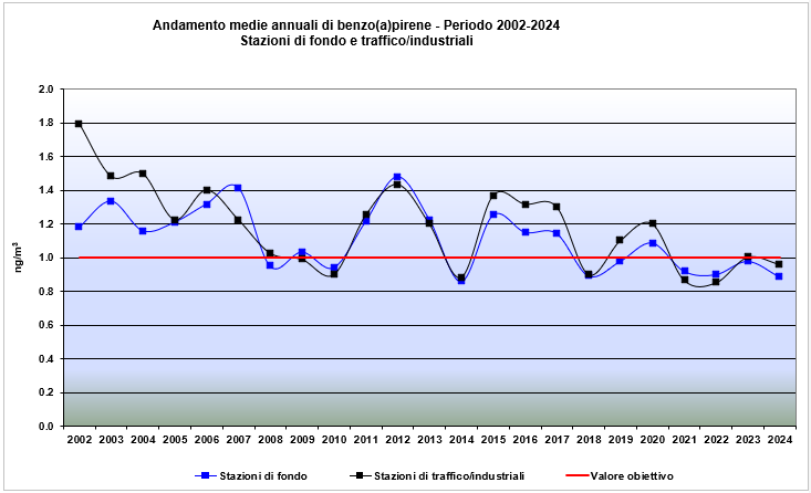 Fig. 2 - Andamento della media annuale di benzo(a)pirene (in ng/m3) dal 2002 al 2024 nelle stazioni “medie” regionali confrontato con il Valore Obiettivo annuale (1.0 ng/m3).