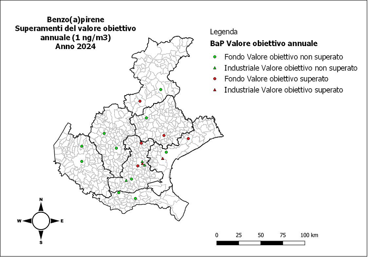 La soglia di concentrazione in aria del benzo(a)pirene è stabilita dal D.Lgs. 155/2010 e calcolata su base temporale annuale. La valutazione dello stato attuale dell’indicatore è basata sul numero di superamenti, registrati presso le stazioni di monitoraggio della qualità dell’aria della rete regionale ARPAV, del Valore Obiettivo (VO) annuale di 1.0 ng/m3. Tale inquinante viene determinato analiticamente sulle polveri PM10.