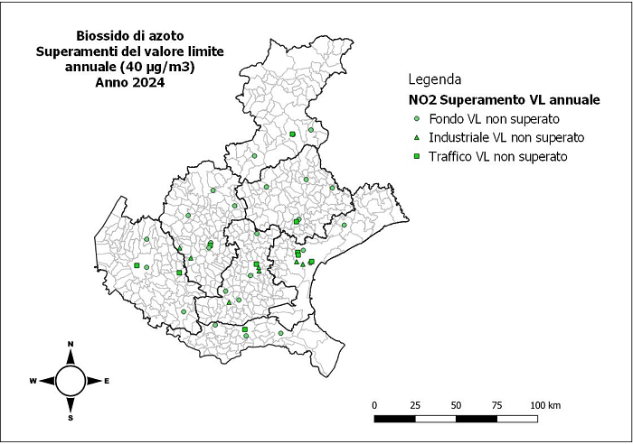 Fig 1 - Mappa regionale del superamento del Valore Limite (VL) annuale di 40 μg/m3 per il biossido di azoto nel 2024 in Veneto. Sono rappresentate le 42 stazioni di monitoraggio attive nel 2024 (percentuale di dati validi 95%), distinte per tipologia e per superamento o meno del VL (il colore verde indica che non vi è superamento).