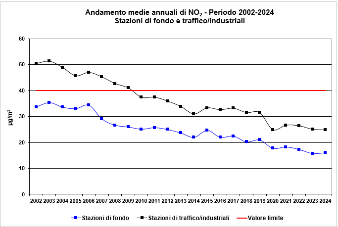 Fig 2 - Andamento della media annuale di NO2 in μg/m3 nelle stazioni "medie" regionali di Background e Traffico/Industriali confrontato con il VL annuale (40 μg/m3), anni 2002-2024.