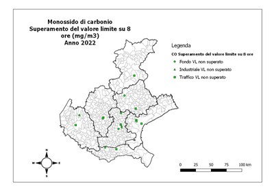 Fig. 1 - Mappa regionale del superamento del Valore Limite(VL) di 10 mg/m3 per il monossido di carbonio nel 2022 nel Veneto. Sono rappresentate le 17 stazioni di monitoraggio attive nel 2022 (percentuale di dati validi 96%), distinte per tipologia e per superamento o meno del VL (il colore verde indica che non vi è superamento).