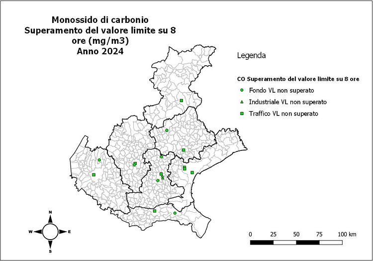 Fig. 1 - Mappa regionale del superamento del Valore Limite(VL) di 10 mg/m3 per il monossido di carbonio nel 2024 nel Veneto. Sono rappresentate le 17 stazioni di monitoraggio attive nel 2024 (percentuale di dati validi 95%), distinte per tipologia e per superamento o meno del VL (il colore verde indica che non vi è superamento).