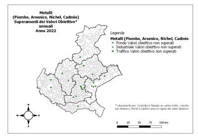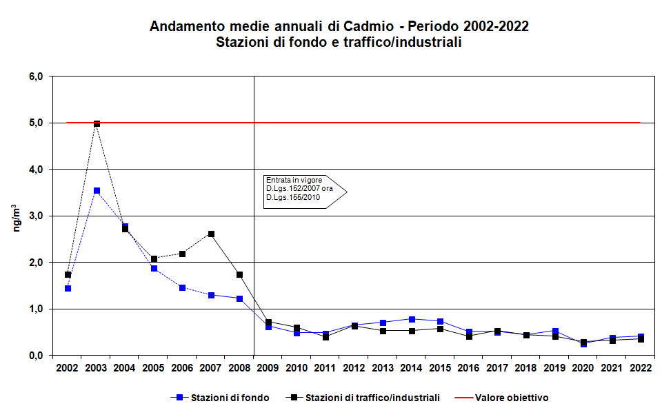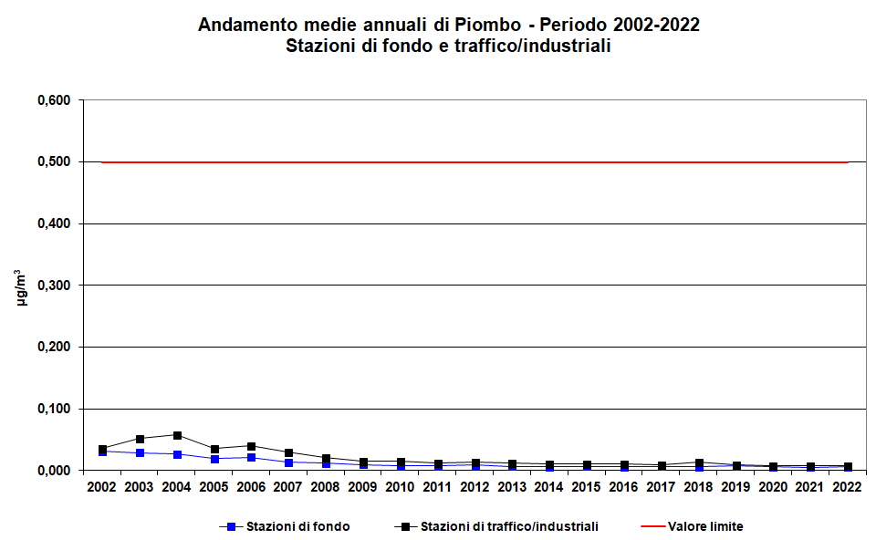 Valore di riferimento | Valore Limite (VL) annuale del Piombo: 0.5 μg/m3, Valori Obiettivo (VO) annuali di Arsenico: 6.0 ng/m3, Cadmio: 5.0 ng/m3 e Nichel: 20.0 ng/m3 |