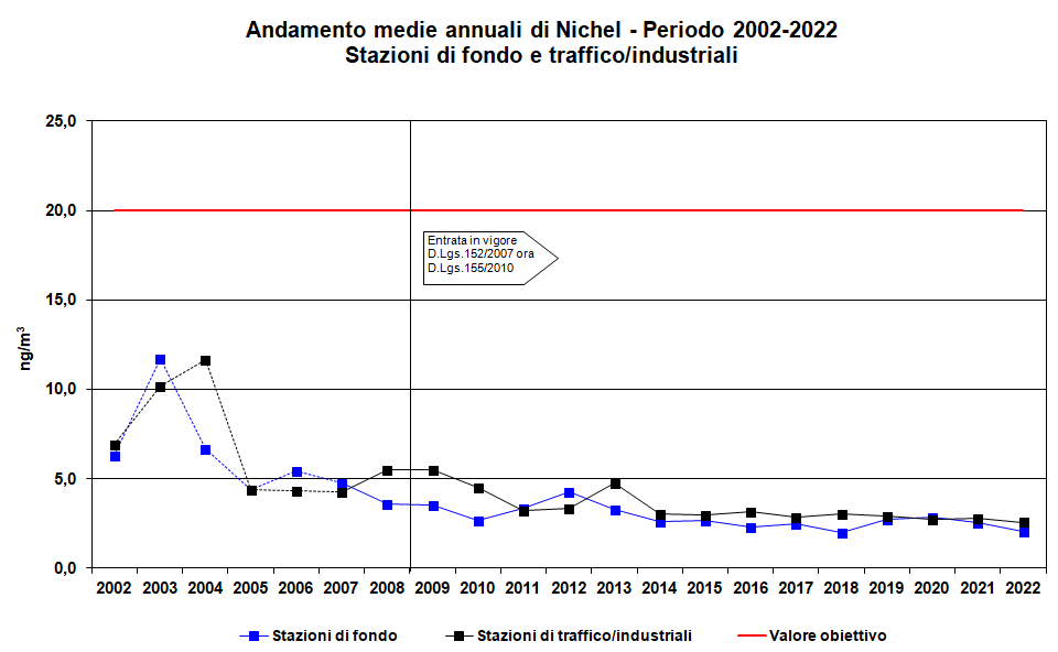 A livello nazionale, gli ultimi dati disponibili per i metalli si riferiscono all’anno 2016 (Qualità dell’ambiente urbano – XIII Rapporto (2017) ISPRA Stato dell’Ambiente 74/17 ISBN 978-88-448-0858-7). I dati disponibili per il 2016 sono relativi a 60 aree urbane. Per arsenico e cadmio i livelli sono ovunque inferiori al valore obiettivo (rispettivamente 6.0 ng/m³, 5.0 ng/m³), mentre il valore obiettivo del nichel (20.0 ng/m³) è stato superato ad Aosta e Terni. A livello regionale non si registrano superamenti dei valori obiettivo per As, Cd e Ni.