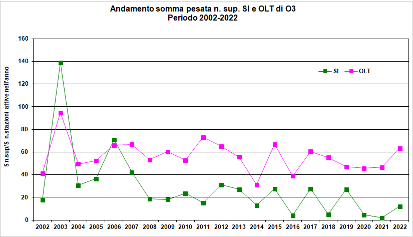 Fig. 2 - Andamento della somma annuale del numero di superamenti della Soglia di informazione (SI) oraria e dell’Obiettivo a Lungo Termine (OLT) di O3 nel periodo 2002-2022, pesata sul totale delle stazioni attive per anno.
