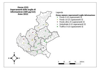 Delle 31 stazioni attive nel 2022, tutte hanno registrato superamenti dell’obiettivo a lungo termine e 22 stazioni hanno registrato superamenti della soglia di informazione. La frequenza maggiore di superamenti della SI e dell’OLT si è verificata presso le stazioni di Background rurale (BR) di Vicenza e Verona.