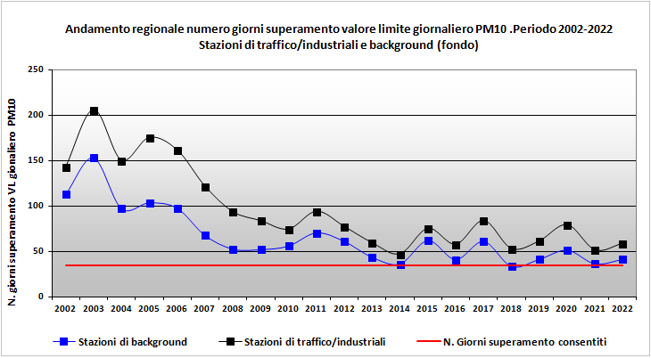 Fig. 5 - Andamento del numero di giorni di superamento del VL giornaliero di PM10 (in μg/m3) nelle stazioni “medie” regionali di Background e di Traffico/Industriali, anni 2002-2022.