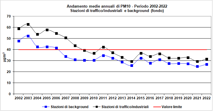 Fig. 4 - Andamento della media annuale di PM10 (in μg/m3) nelle stazioni “medie” regionali di Background e di Traffico/Industriali confrontato con il VL annuale (40 µg/m3), anni 2002-2022.