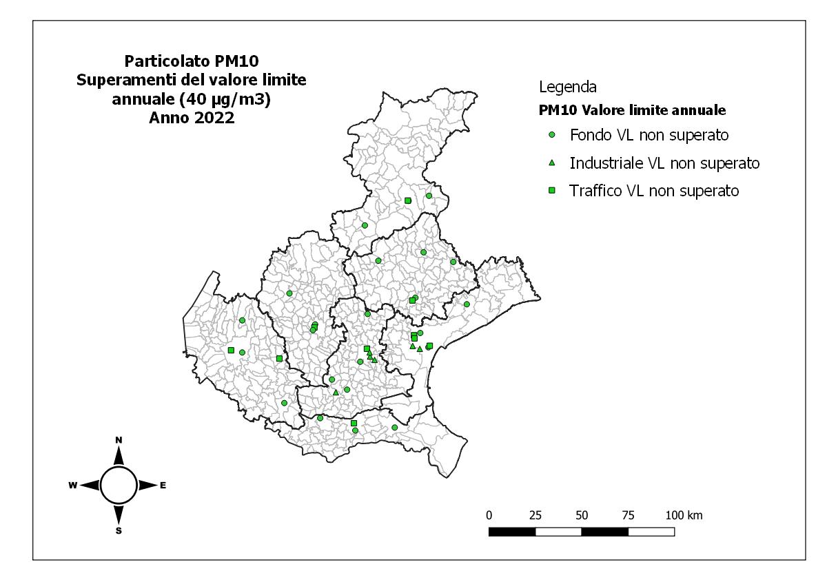 Fig. 2 - Mappa regionale del Veneto del superamento del Valore Limite (VL) annuale di 40 μg/m3 di PM10 nel 2022. Valore Limite annuale registrato presso 39 stazioni attive nel 2022 e con una percentuale di dati validi attorno al 98%. Le stazioni sono distinte per tipologia e per superamento o meno del VL (il colore verde indica che non vi è superamento).