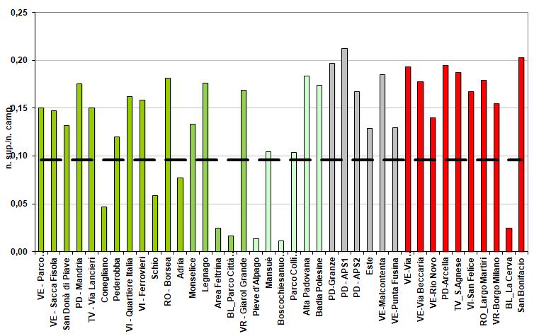Le soglie di concentrazione in aria delle polveri fini PM10 sono stabilite dal D.Lgs. 155/2010 e calcolate su base temporale giornaliera ed annuale. È stato registrato il numero di superamenti, dal 2002 al 2022, presso le stazioni di monitoraggio della qualità dell’aria della rete regionale ARPAV, di due soglie di legge: Valore Limite (VL) annuale per la protezione della salute umana di 40 μg/m3; Valore Limite (VL) giornaliero per la protezione della salute umana di 50 μg/m3 da non superare più di 35 volte/anno.