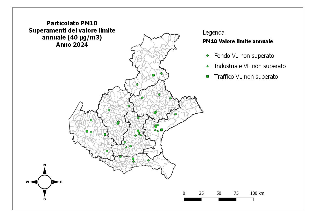 Fig. 2 - Mappa regionale del Veneto del superamento del Valore Limite (VL) annuale di 40 μg/m3 di PM10 nel 2024. Valore Limite annuale registrato presso 40 stazioni attive nel 2024 e con una percentuale di dati validi attorno al 98%. Le stazioni sono distinte per tipologia e per superamento o meno del VL (il colore verde indica che non vi è superamento).
