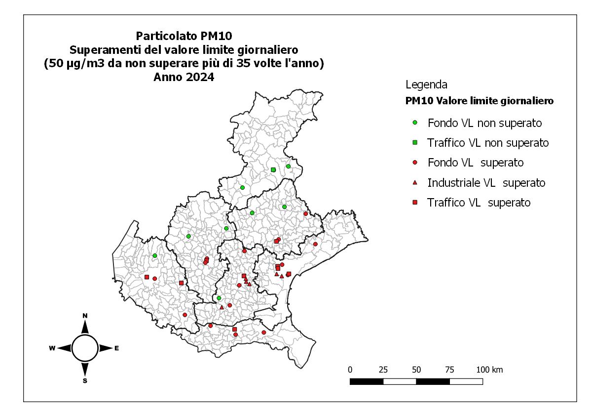 Le soglie di concentrazione in aria delle polveri fini PM10 sono stabilite dal D.Lgs. 155/2010 e calcolate su base temporale giornaliera ed annuale. È stato registrato il numero di superamenti, dal 2002 al 2024, presso le stazioni di monitoraggio della qualità dell’aria della rete regionale ARPAV, di due soglie di legge: Valore Limite (VL) annuale per la protezione della salute umana di 40 μg/m3; Valore Limite (VL) giornaliero per la protezione della salute umana di 50 μg/m3 da non superare più di 35 volte/anno.