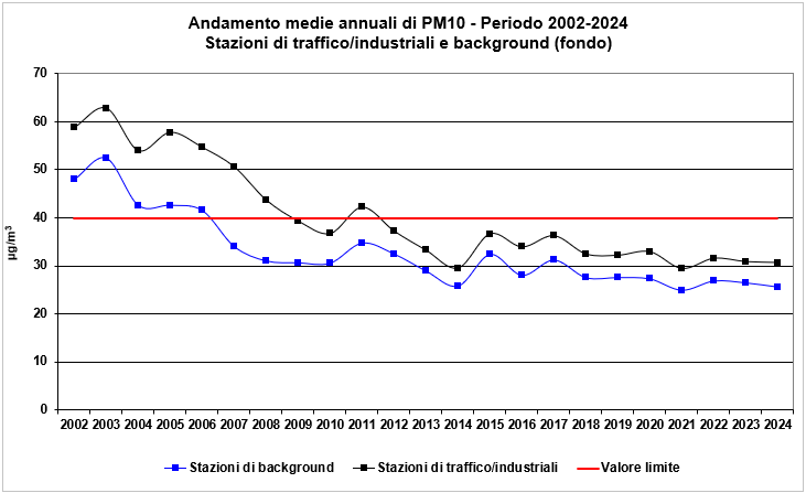Fig. 5 - Andamento della media annuale di PM10 (in μg/m3) nelle stazioni “medie” regionali di Background e di Traffico/Industriali confrontato con il VL annuale (40 µg/m3), anni 2002-2024.