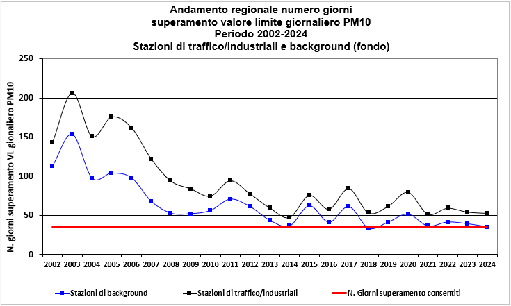 Fig. 4 - Andamento del numero di giorni di superamento del VL giornaliero di PM10 (in μg/m3) nelle stazioni “medie” regionali di Background e di Traffico/Industriali, anni 2002-2024.