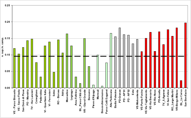 A livello nazionale, gli ultimi dati disponibili si riferiscono all’anno 2024 (Informativa ISPRA La qualità dell’aria in Italia nel 2024). Il valore limite annuale, pari a 40 μg/m³, è stato rispettato in tutte le stazioni di misura, con l’eccezione di un punto di misura a Palermo, verosimilmente a causa di fenomeni intensi di intrusione di sabbie desertiche e di attività di sfalcio meccanico nell’intorno della stazione. Nei precedenti cinque anni, si era comunque verificato il sostanziale rispetto di tale limite su tutto il territorio nazionale, con qualche isolata eccezione. Nel 2024, il valore limite giornaliero (50 μg/m³ come media giornaliera, da non superare più di 35 volte in un anno) è stato superato in 96 stazioni, pari al 17% dei casi. In particolare, i superamenti (80 casi su 96) sono diffusi nell’area del bacino padano sia negli agglomerati che nelle zone pianeggianti suburbane e rurali. Come già evidenziato in precedenza, nel 2024 in Veneto il valore limite giornaliero del PM10 è stato superato in 18 stazioni, pari al 45% del totale; non si sono verificati superamenti del valore limite annuale.