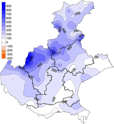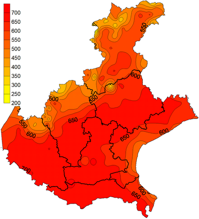 Nel Veneto, nel semestre primaverile/estivo 2024 l’ET0 stimata è risultata in linea con la media. Si segnala un eccesso di evapotraspirazione nella zona del delta del Po. L’ET0 stimata sulla gran parte della pianura veneta è risultata compresa tra i 600 e i 700 mm.
