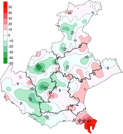 Il BIC del semestre primaverile-estivo nel 2024 risulta essere negativo (deficit idrico) in gran parte della pianura (ad eccezione delle coste centrali del veneziano), anche se in misura minore rispetto ai valori storici del periodo 1991-2020, e positivo, con un surplus idrico anche di molto superiore alla norma nelle zone pedemontane, prealpine e alpine.