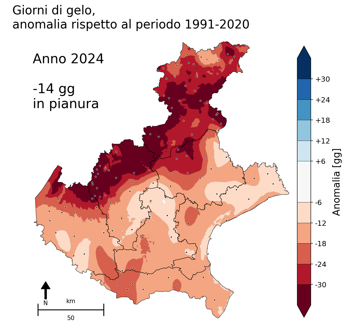 Dall'analisi delle spazializzazioni relative agli scarti del numero di giorni di gelo rispetto alla norma si deduce un 2024 “più caldo” con un numero di giorni di gelo inferiore al valore medio del periodo 1991-2020, in particolare durante l’inverno. Questo dato conferma il trend che indica una diminuzione significativa del numero di giorni di gelo a partire al 1991.