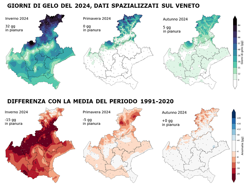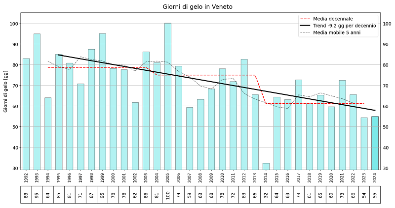 Nel corso del 2024 mediamente in Veneto, escluse le zone montane, i giorni di gelo (41) sono stati di 14 giorni inferiori al valore storico del periodo 1991-2020 (55 giorni).