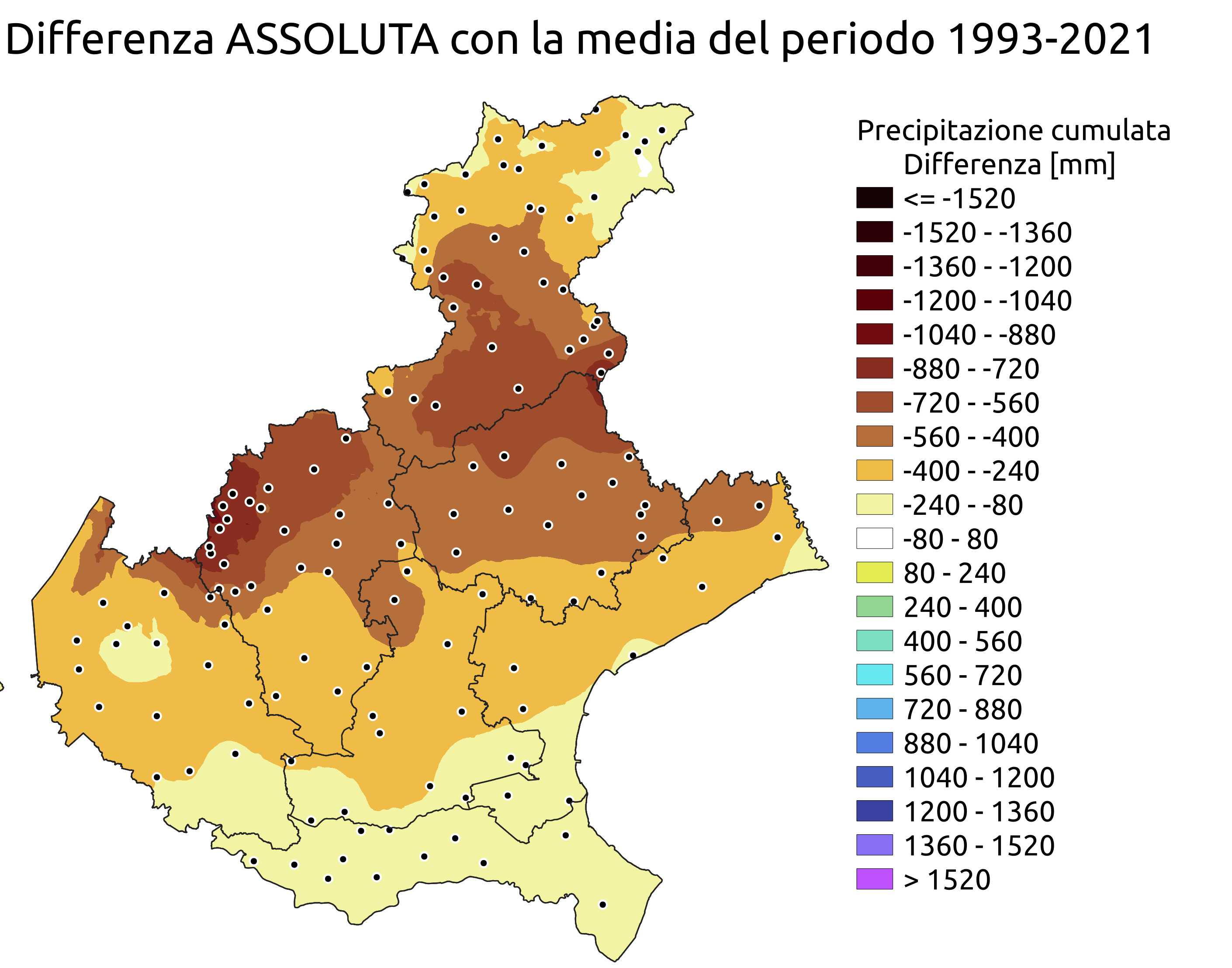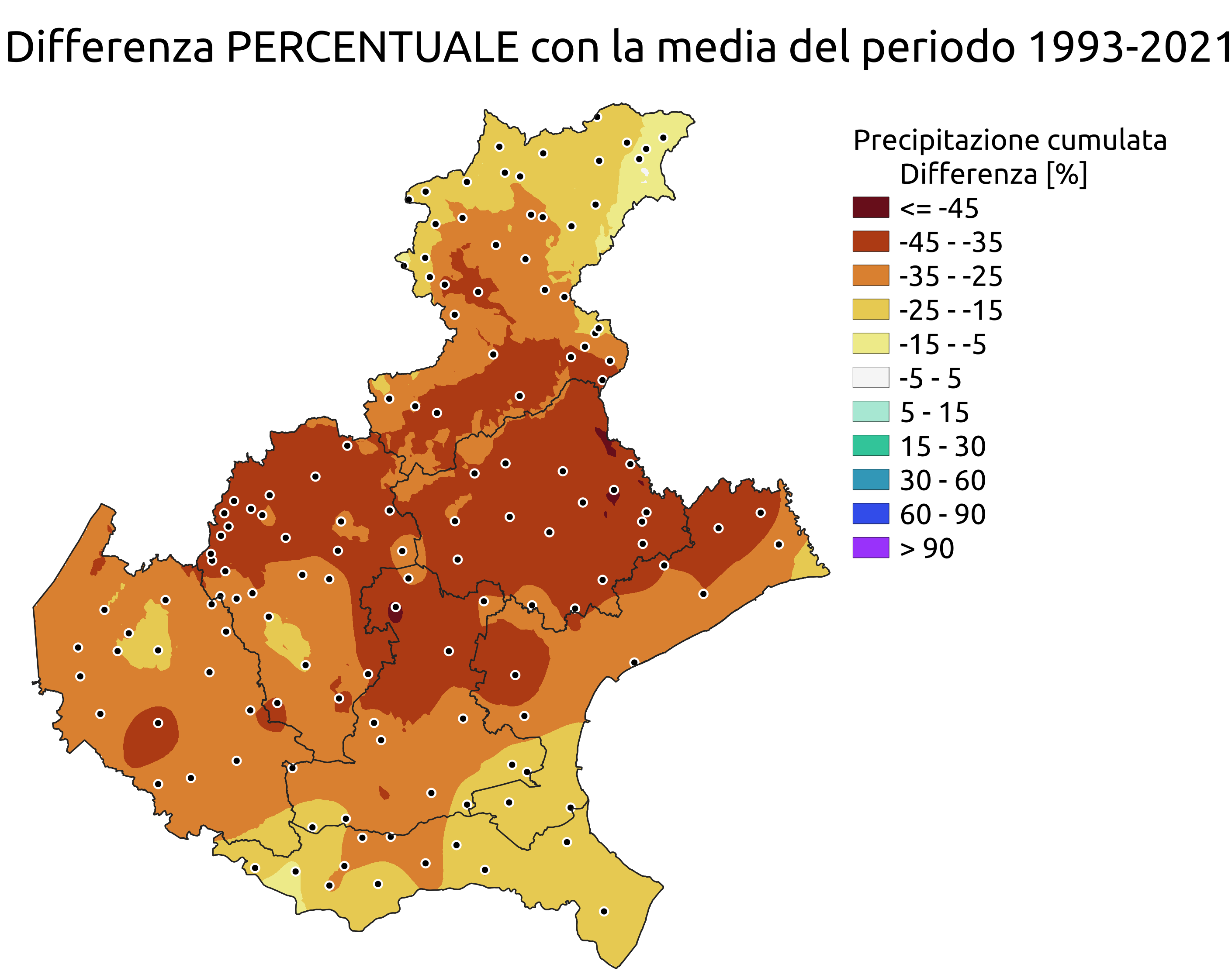 Per ottenere informazioni di sintesi, i dati pluviometrici mensili puntuali sono stati interpolati utilizzando la tecnica del “ordinary kriging".