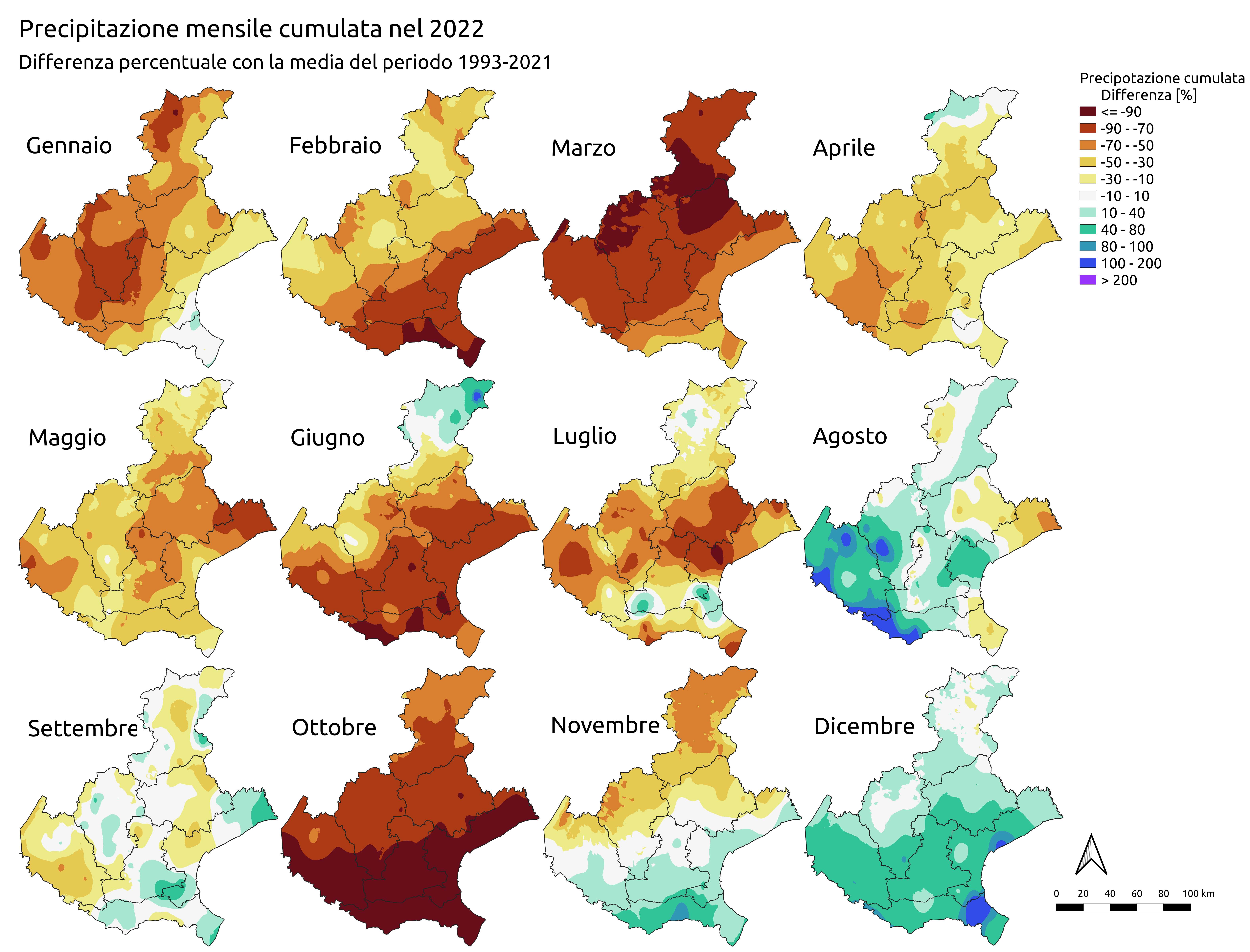 Confrontando l’andamento delle precipitazioni mensili del 2022 con quello delle precipitazioni mensili del periodo 1993-2021 si rileva che, effettuando una media su tutto il territorio regionale, gli apporti risultano: