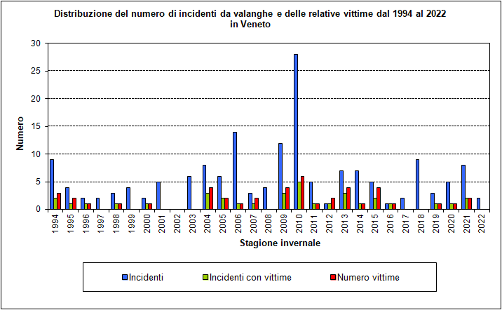 Sulla montagna veneta, dalla stagione invernale 1993/94 alla stagione invernale 2020/21, vi sono stati mediamente 6 incidenti da valanga, nei quali trova la morte 1-2 persone all’anno, con un incremento negli ultimi anni, a testimonianza dell'aumento del numero di frequentatori della montagna.