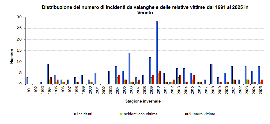 Sulla montagna veneta, dalla stagione invernale 1990/91 alla stagione invernale 2019/20 (trentennio climatico), vi sono stati mediamente 5-6 incidenti da valanga, nei quali trova la morte 1-2 persone all’anno.