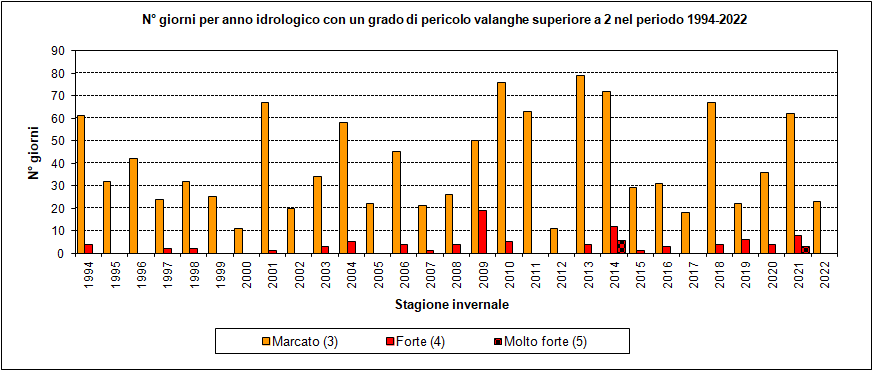 I dati disponibili, ricavati dal Bollettino regionale del pericolo di valanghe (situazione attuale) coprono il periodo dal 1993/1994 (stagione invernale nella quale è stata adottata a livello europeo la scala unificata) al 2021/2022.