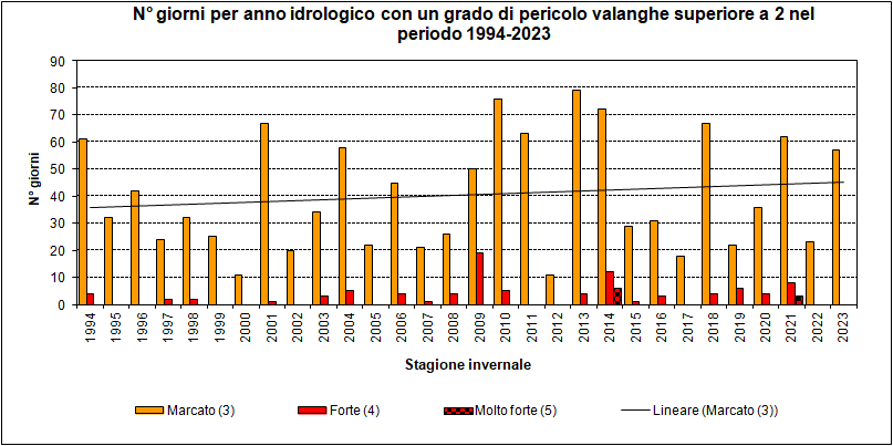I dati disponibili, ricavati dal Bollettino regionale del pericolo di valanghe (situazione attuale) coprono il periodo dal 1993/1994 (stagione invernale nella quale è stata adottata a livello europeo la scala unificata) al 2022/2023.