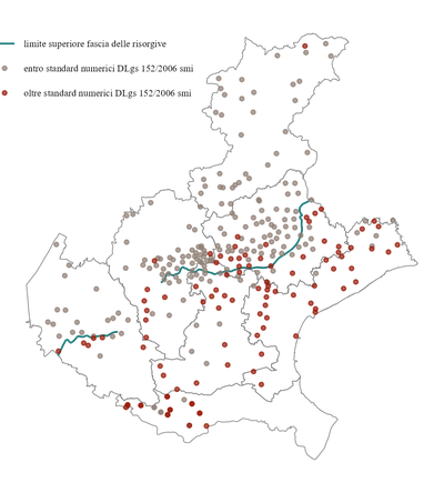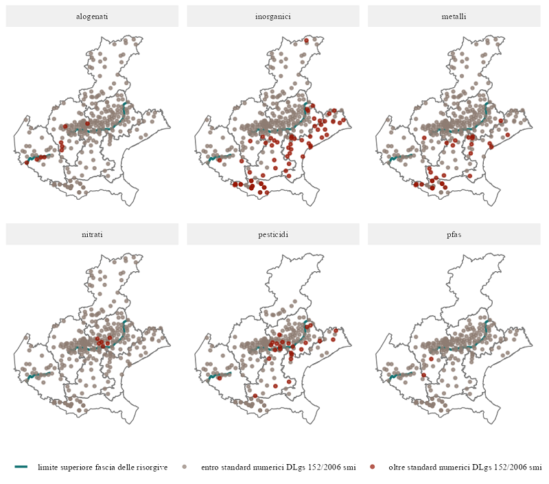 Osservando la distribuzione dei superamenti nel territorio regionale si nota una netta distinzione tra le tipologie di inquinanti presenti a monte ed a valle della del limite superiore della fascia delle risorgive: nell’acquifero indifferenziato di alta pianura la scarsa qualità è dovuta soprattutto a pesticidi, nitrati e composti organo alogenati; negli acquiferi differenziati di media e bassa pianura a sostanze inorganiche e metalli. Entrambi i punti con superamento del valore soglia per almeno un composto perfluorurato si trovano nell’area del pennacchio di contaminazione con origine a Trissino.