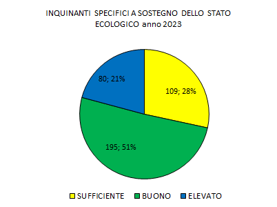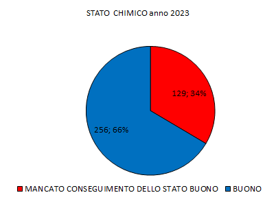 Nel 2023 la valutazione della qualità chimica ha interessato complessivamente 385 punti di monitoraggio, 256 dei quali (pari al 66%) sono stati valutati con stato chimico buono, in quanto non presentano alcun superamento degli standard di qualità per le sostanze prioritarie (SQA-MA e SQA-CMA) e 275 siti (pari al 72%) sono stati valutati con qualità buona o elevata in quanto non presentano superamenti degli SQA-MA per gli inquinanti specifici a sostegno dello stato ecologico.